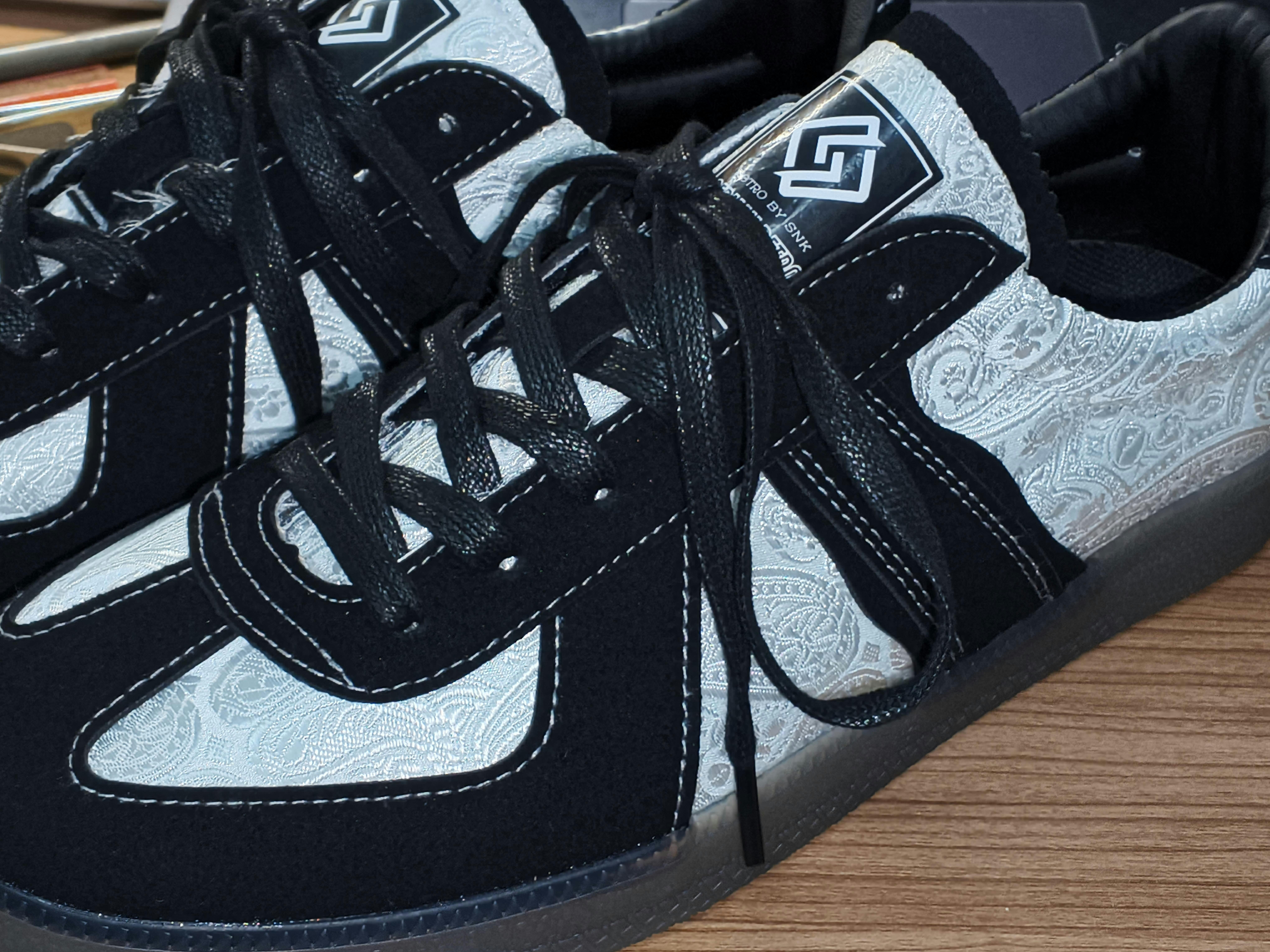 Crafted with precision, its upper features an intricate paisley-textured fabric wrapped in deep black suede overlays—bringing contrast, character, and sophistication to every step. The translucent gum sole adds a retro touch that grounds the look in timeless street sensibility.