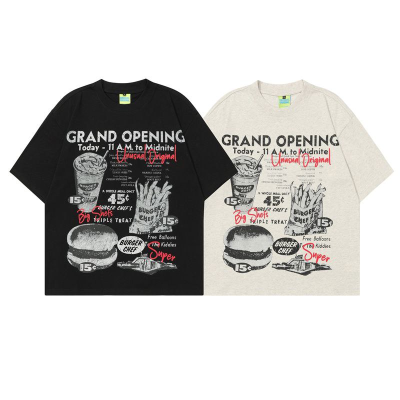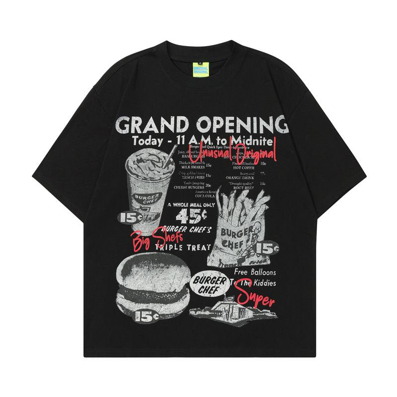 Featuring a nostalgic "Grand Opening" print with retro burger, fries, and soda graphics, this tee blends old-school charm with a modern oversized silhouette. Whether styled casually with jeans or layered under a jacket, it’s designed to keep you looking fresh and effortlessly cool.