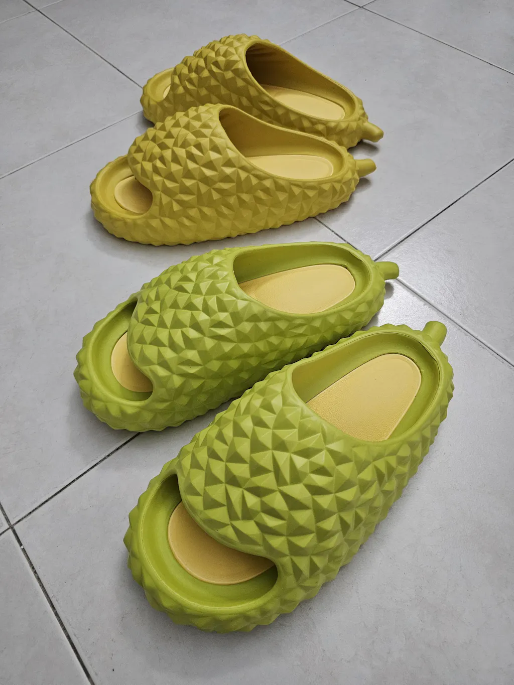 The elegant design features durian-inspired colors and patterns, making these slippers the perfect way to relax in style.