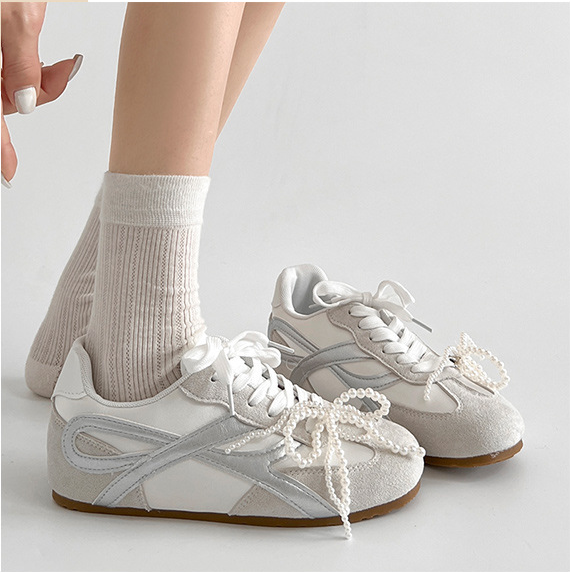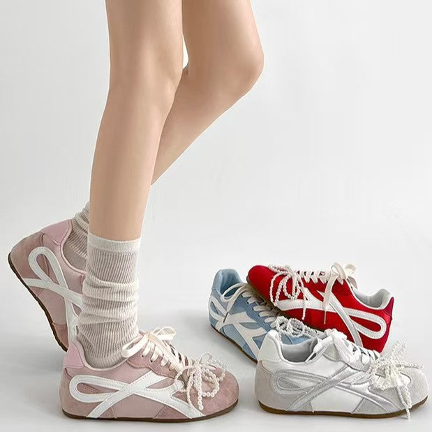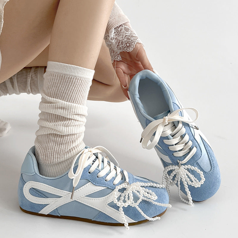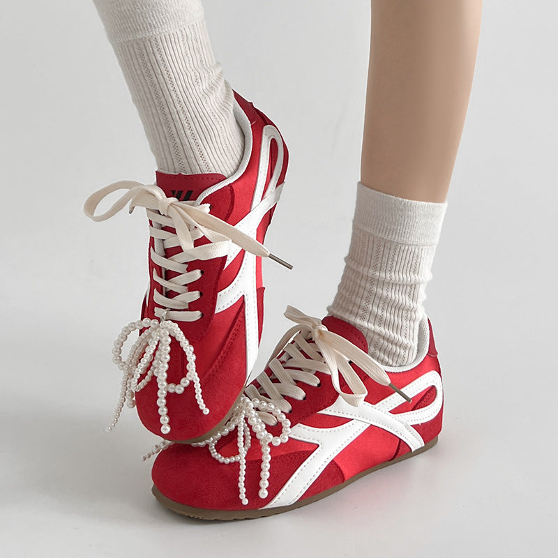 Crafted in a blend of suede and smooth leather-like textures, it features playful colorways that pop β from soft blush to icy white, sky blue, and bold crimson. Each pair comes with a charming lace option, and select styles include a removable pearl accessory for an extra dash of cuteness.
