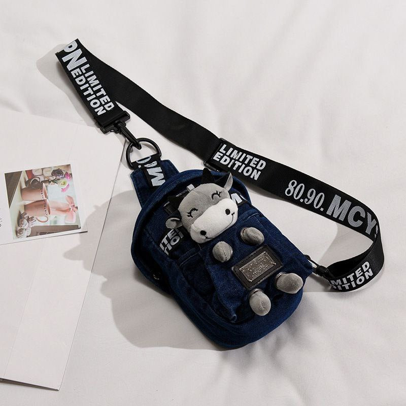 Tired of boring bags? Meet the Denim Buddy Slingāthe ultimate fusion of vintage streetwear style and adorable, playful charm. This mini-messenger is more than just a bag; it's a statement piece that carries your essentials and your favorite plush companion wherever you go!